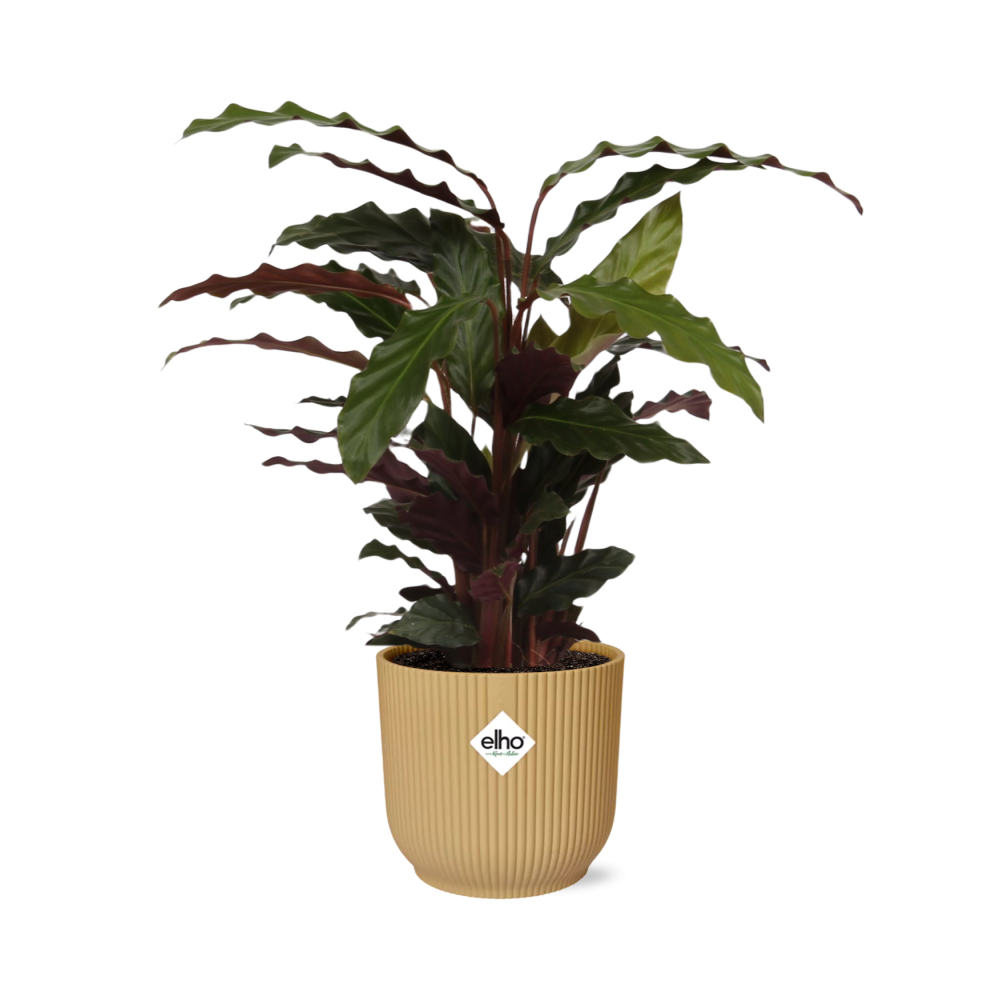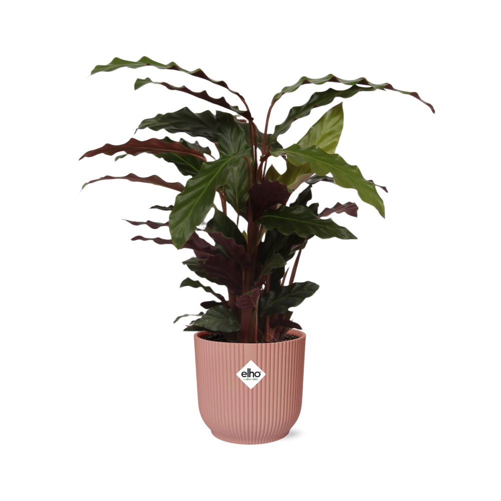 Calathea is een populaire kamerplant die bekend staat om zijn opvallende bladeren en luchtzuiverende eigenschappen. Van nature afkomstig uit de tropische regio's van Centraal- en Zuid-Amerika, gedijt de Calathea goed in warme en vochtige omgevingen. Zijn oorspronkelijke habitat omvat landen als Brazilië, Colombia en Venezuela, waar het groeit onder het bladerdak van dichte bossen.Deze tropische plant heeft zich aangepast aan de lage lichtomstandigheden die te vinden zijn op de bosbodem, waardoor het een ideale keuze is voor binnenruimtes met indirect zonlicht. Zijn grote, levendige bladeren hebben verschillende patronen en kleuren, waardoor het een visueel aantrekkelijke toevoeging is aan elke kamer. Calathea helpt ook de luchtkwaliteit te verbeteren door gifstoffen uit te filteren en zuurstof af te geven, waardoor het een uitstekende keuze is voor mensen die een gezondere binnenomgeving willen creëren. Om goed voor een Calathea te zorgen, moet deze op een plek worden geplaatst die halfschaduw of schaduw krijgt. Het gedijt goed met regelmatig water geven, waarbij de grond constant vochtig maar niet drassig moet zijn. Calathea geeft de voorkeur aan goed doorlatende grond die wat vocht vasthoudt. Wat betreft meststoffen, wordt aanbevolen om de plant elke twee tot vier weken tijdens het groeiseizoen te voeden met een uitgebalanceerde kamerplantmeststof. Als de plant in zijn decoratieve pot arriveert, zorg er dan voor dat je de ideale plek voor hem vindt en de nodige zorg biedt om hem goed te laten gedijen. Calathea planten zijn populaire keuzes voor binnenruimtes vanwege hun prachtige en levendige bladeren. Ze staan bekend om hun vermogen om de lucht te zuiveren, waardoor ze ideaal zijn om een vleugje groen toe te voegen aan elke kamer en tegelijkertijd de luchtkwaliteit te verbeteren. Met hun unieke patronen en kleuren worden Calathea planten niet alleen gebruikt als decoratieve elementen, maar dienen ze ook als natuurlijke luchtzuiveraars.
